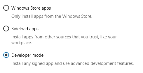 First, you need to install Windows Subsystem for Linux. Go to Settings -> Update and Security -> For developers and change Sideload apps setting to Developer mode