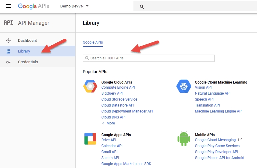 Bước này khá quan trọng. Bước này để enable thư viện nào mà API được phép sử dụng. Chúng ta sẽ Enable những như viện sau