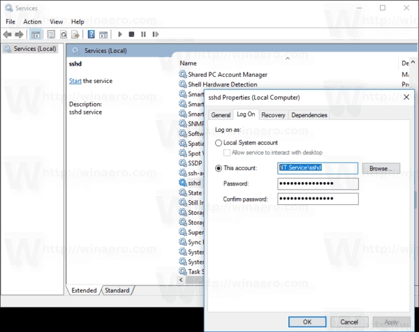 On the "Log On" tab, see the user account which is used by the sshd server. In my case, it is NT Service\sshd.