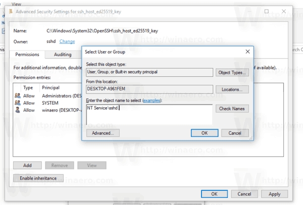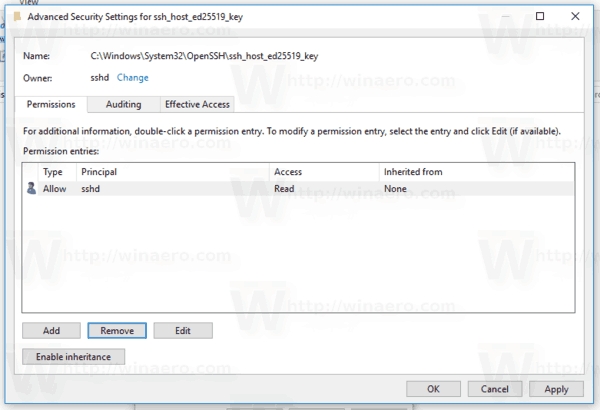 Click "Add" and add the permission "Read" for the user "NT Service\sshd". Now, remove all other permissions to get something like this:Click "Apply" and confirm the operation.
