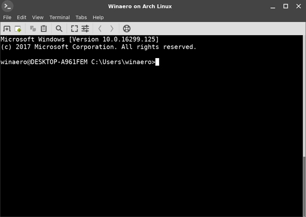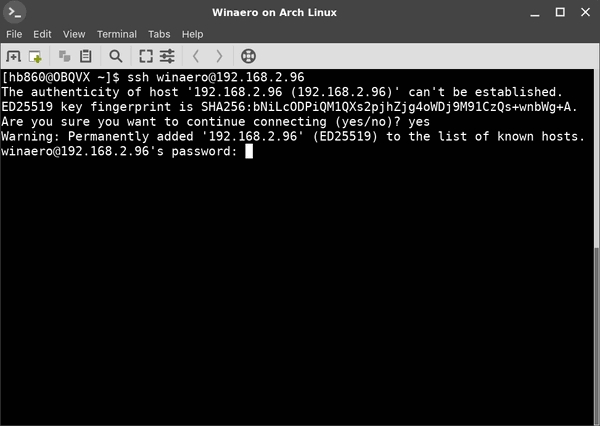 ssh winaero@192.168.2.96Where winaero is my Windows user name and 192.168.2.96 is the IP address of my Windows 10 PC. I will connect to it from another PC, running Arch Linux.