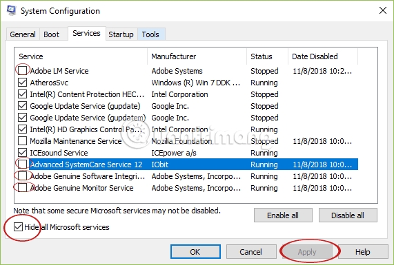Trong cửa số System Configuration, bạn chọn tab Services, tại đây sẽ hiển thị danh sách tất cả các dịch vụ của máy tính. Ở cuối cửa sổ có một tùy chọn là Hide all Microsoft services, bạn tích vào đó để ẩn các dịch vụ của Microsoft đi, tiếp theo bỏ chọn ở những dịch vụ mà bạn thấy không cần thiết. Ví dụ như trong hình mình bỏ chọn một số dịch vụ của Adobe, Advanced SystemCare, Mozilla (vì mình dùng Chrome là chính, Firefox chỉ để test tính năng, nếu bạn dùng chính là Firefox thì đừng bỏ chọn cái này nhé). Nhấn Apply khi bạn hoàn tất việc chọn.