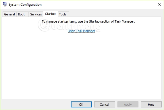 Bạn mở tab Startup, trên Windows 7 trở về trước, bạn có thể bỏ chọn những ứng dụng không muốn khởi động cùng hệ thống tại đây, nhưng trên Windows 10 nó sẽ chỉ bạn đến Task Manager, bạn làm tiếp theo bước 2 bên dưới nhé.