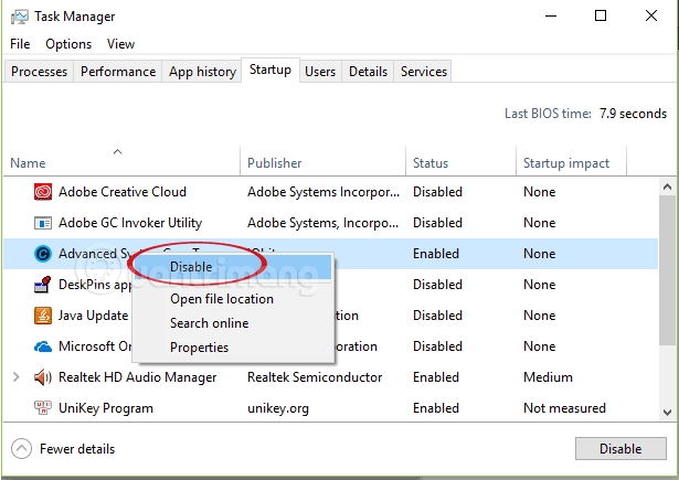 Tại đây kích chuột phải vào các chương trình mà bạn muốn ngừng khởi động cùng hệ thống Windows 10, sau đó click chọn Disable là xong.
